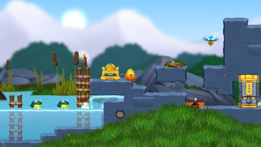 Mais il faut vite le faire rouler en le sifflant, sous peine de voir ce gros oiseau s’en emparer pour l’amener jusqu’à son nid. Voilà un moment typique de Toki Tori 2, ou les niveaux sont extrêmement intelligents et les actions diverses et à combiner avec beaucoup de patience. Il faudra même siffler certaines notes dans l’ordre pour revenir au dernier checkpoint si on est bloqué ou encore, affiche une sorte de radar nous signalant ou se trouvent les objets à dénicher. À moins que ce ne soit le poussin ? C’est qu’il est beau, ce Toki Tori 2. Loin d’être bête aussi, tant il propose une progression faite de défis perpétuels, de compréhension du niveau, d’enchevêtrement d’actions et de fragments mystérieux à collecter dans les endroits les plus improbables. Toki Tori 2 a tout du bon jeu ! Et pourtant, il se vautre rapidement dans la répétitivité crasse et le manque violent de rythme pour nous endormir à chaque porte de nouveau niveau franchie.