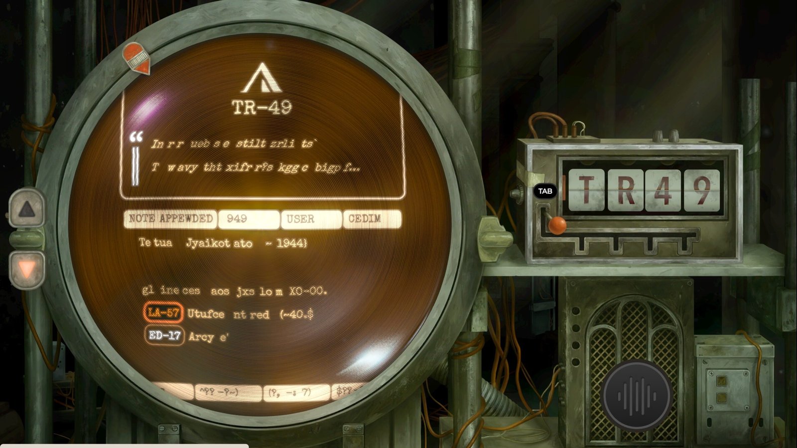 La machine fonctionne grâce à des codes de référence. Chaque entrée est en effet associée à une référence composée de deux lettres et deux chiffres, par exemple TR-49, et c’est uniquement grâce à elle que l’on pourra naviguer dans les archives. Il s’agit d’ailleurs de la seule façon d’interagir directement avec la machine : entrer un code et découvrir ce qu’il renferme. L’idée est donc de trouver ou de déduire de nouvelles références menant vers de nouvelles entrées, nous apportant des informations supplémentaires donnant accès à d’autres pistes de recherche. De ce point de vue, le jeu se rapproche du principe de Her Story et de son moteur de recherche volontairement limité.