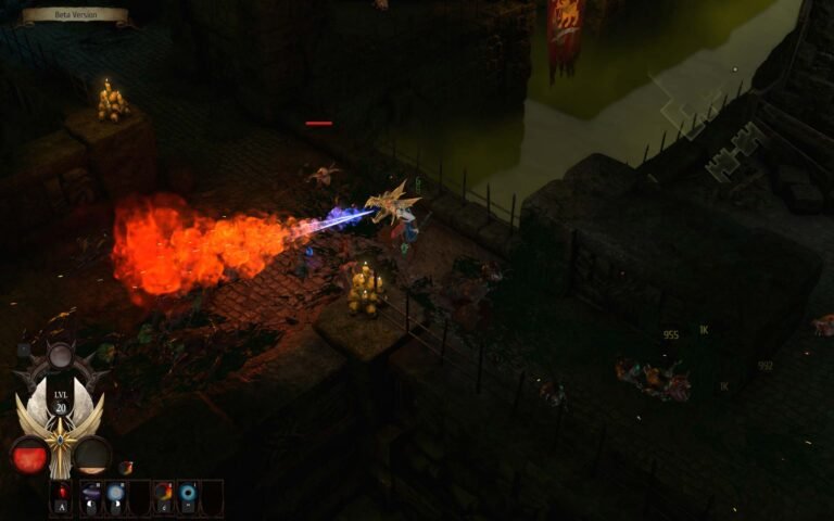 Les tirs d’armes ne sont pas continus, il vous faut cliquer/appuyer sur la gâchette de votre manette en continu si vous voulez shooter de l’ennemi. Cela se joue comme n’importe quel Twin Stick Shooter ( comme Geometry Wars, si vous préférez ) à ceci près que la caméra vous laisse peu de lisibilité autour de vous histoire de compliquer la réception des tirs ennemis. Heureusement, vous pouvez… les découper, avec votre épée, pour les renvoyer en petits morceaux sur vos assaillants.