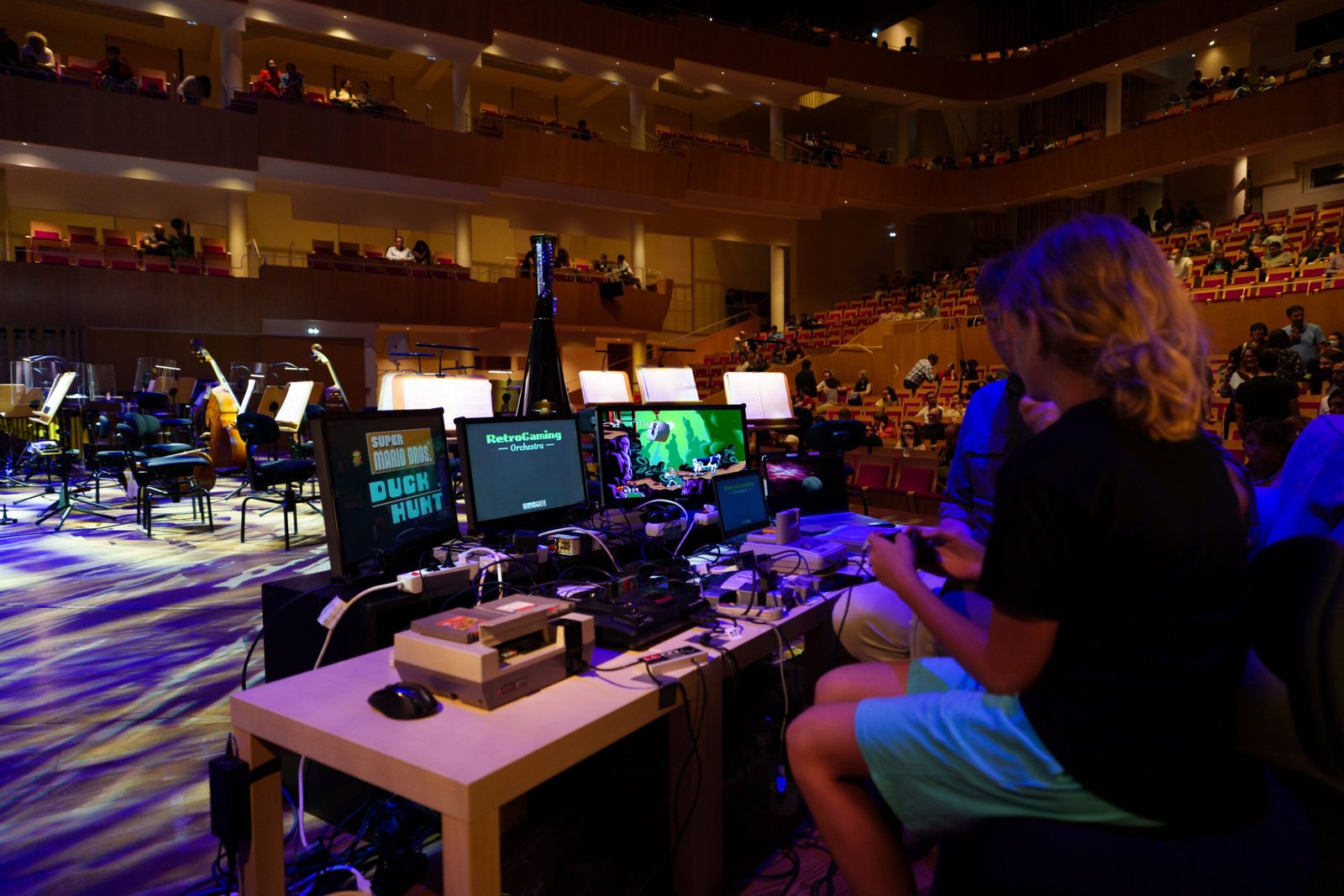 L’ambiance est joyeuse, notamment à l’annonce des personnes tirées au sort pour rejoindre l’association MO5 en bord de scène et avoir l’honneur de projeter leur partie sur l’écran qui surplombe l’orchestre. La promesse est alléchante, elle remet le jeu vidéo au centre par l’interactivité, et qui n’a pas rêvé d’entendre un orchestre symphonique déclencher le thème de votre jeu préféré alors que vous arrivez sur l’écran titre ? Moi, j’aimerais bien en tout cas.