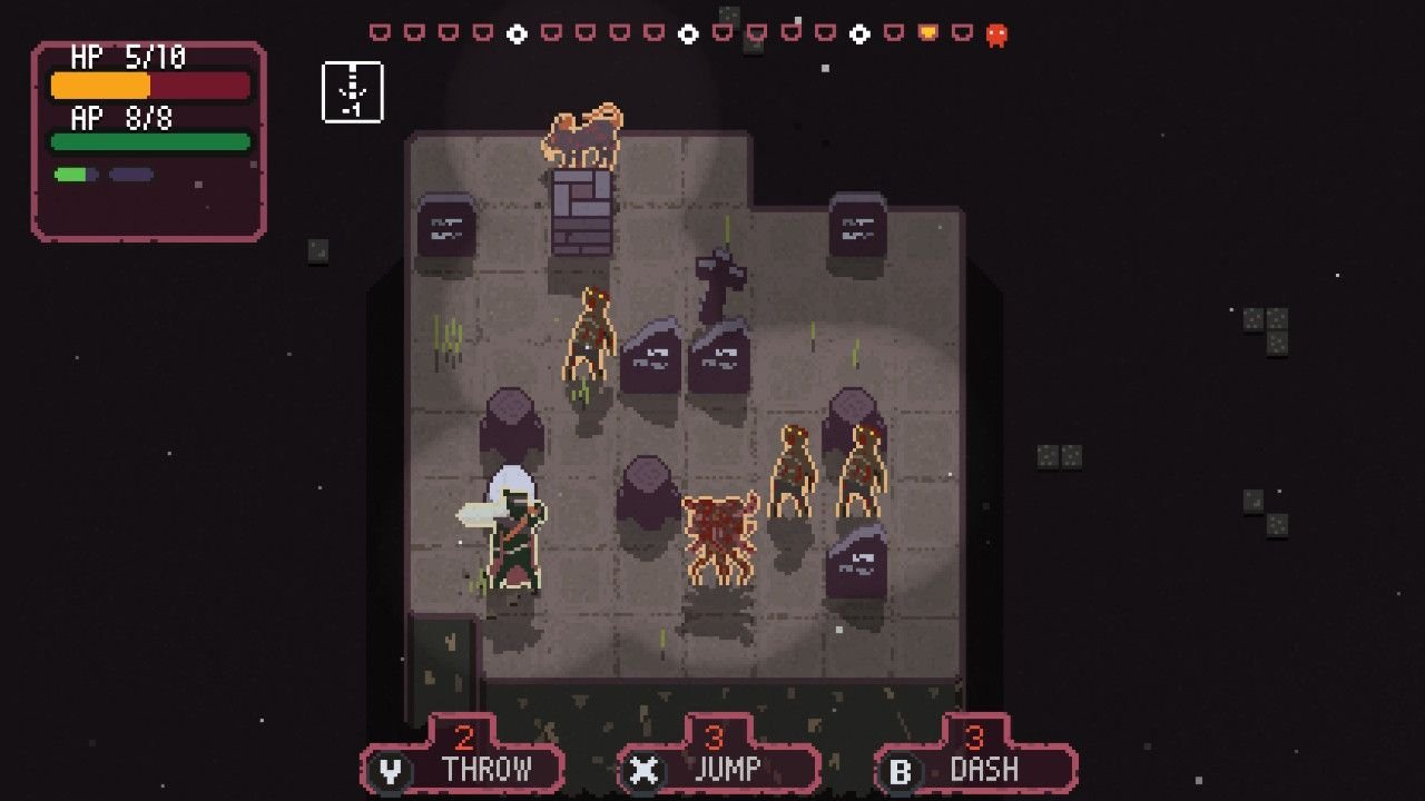 À chaque tour, primera la position de votre avatar plutôt que l’annihilation de l’ennemi. À chaque dash / déplacement et saut, il faudra s’assurer qu’aucun ennemi ne sera à portée et qu’il vous restera suffisamment de points action pour fuir (ou attaquer) au prochain tour. D’autant plus, que l’une des stratégies consiste à lancer son épée (sur un ennemi ou non) vous faisant ainsi perdre du poids, qui a pour avantage de diviser par deux le nombre de points d’action pour dasher ou sauter. Sachant que ce dernier permet de repousser les ennemis d’une case, et s’ils percutent votre épée, ils meurent.