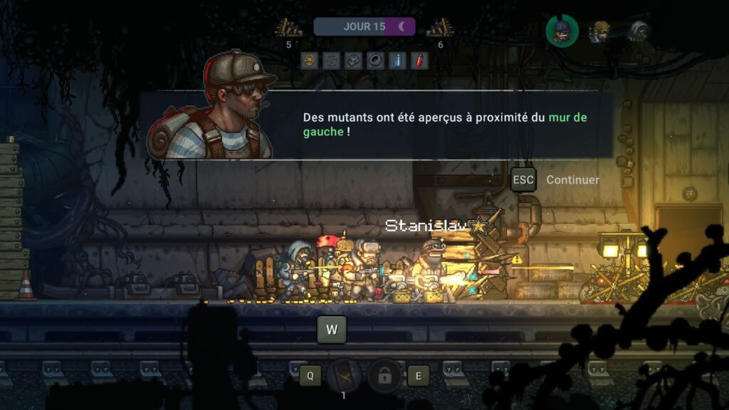 Si vous n’avez jamais joué à Kingdom (jouez-y), je vais faire un rapide topo sur le principe du genre. Dans Until We Die, vous contrôlez un officier en chef (Ivan ou Anna) et établissez un camp de défense dans un endroit qui rappelle fortement les tunnels de Metro 2033 . Ce camp de défense peut s’étendre de gauche à droite seulement et se construira sous vos ordres, et en échange de ressources trouvées dans les tunnels (pièces de ferraille, nourriture, points de recherche etc.). Kingdom avait fait le pari d’être le plus minimaliste possible, avec peu de boutons, une seule ressource et une IA qui gère automatiquement les troupes. Ici, on est plutôt dans une démarche inverse. Construire des bâtiments, dénicher des vivres ou des survivants, défendre les murs contre les invasions de mutants etc., tout ceci devra être géré de A à Z par vos soins, avec de la micro-gestion de vos larbins. Fort heureusement, tout se fera simplement au clavier (ou à la manette) en allant de gauche à droite seulement, pas de déplacement à la souris.