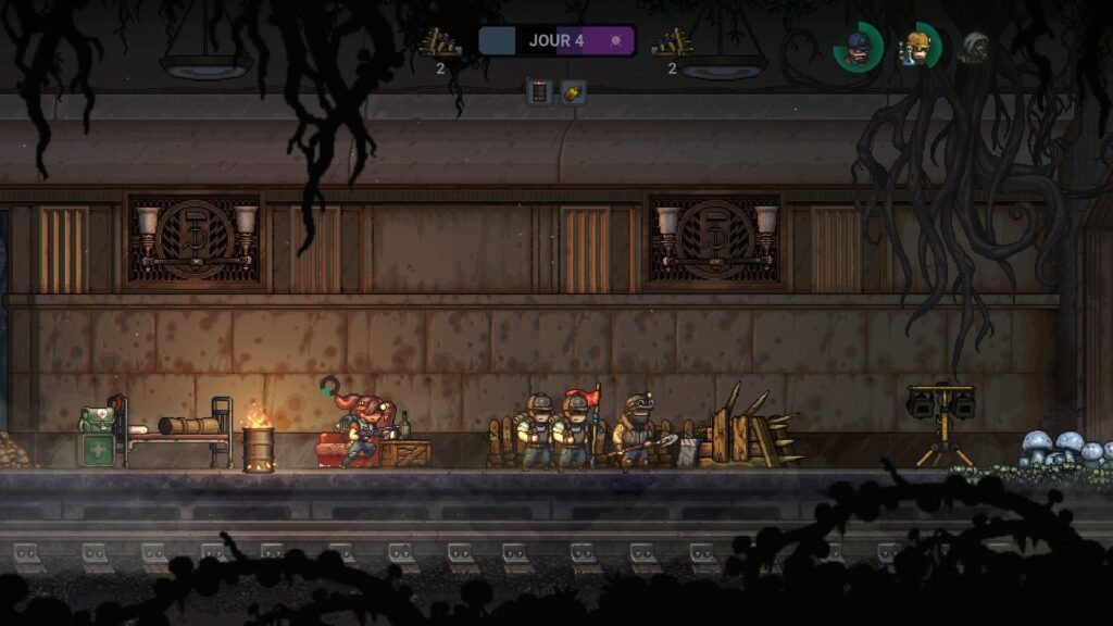 Comme vu plus haut, même si la comparaison avec Kingdom est assez facile, Until We Die arrive quand même à proposer quelque chose de différent. Visuellement déjà, avec un pixel art beaucoup moins minimaliste et presque cartoonesque (très inspiré de Metal Slug). Ensuite, le jeu propose une légère dimension rogue-lite avec la possibilité de choisir entre 2 passifs à certains moments clé de votre progression, de quoi varier légèrement votre manière de jouer. On regrette juste que les passifs soient assez peu nombreux et qu’on se retrouve très vite à refaire la même partie en boucle, surtout que le terrain de jeu ne change pas d’un iota, vous avez les mêmes portes, les mêmes nids et les mêmes ressources aux mêmes endroits. En revanche, en jouant, le jeu débloque de nouvelles choses petit à petit, de quoi éviter de rendre la mort trop punitive (et inutile).