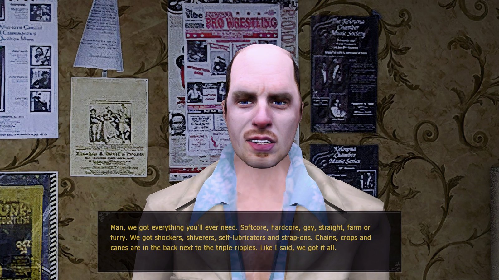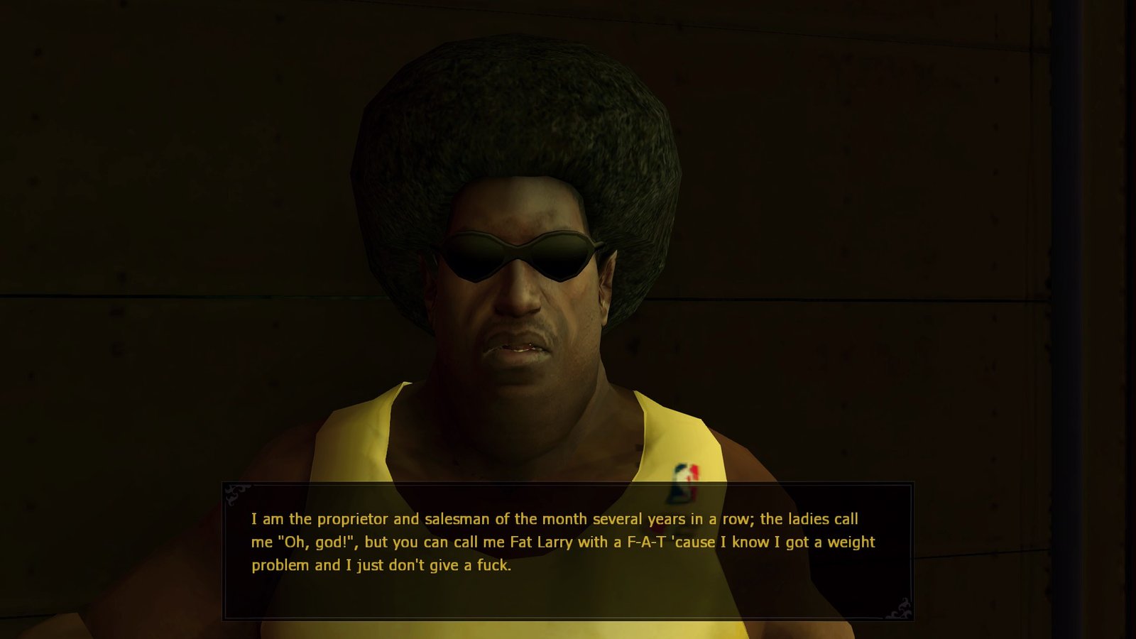 D’autant que vous aurez souvent plusieurs choix de conversation, dont certains seront disponibles seulement si vous avez investis votre XP dans les dans les bonnes capacités. Mieux encore, ce travail minutieux d’écriture est sublimé par un doublage exceptionnel pour l’époque, avec un casting franchement mémorable. On y trouvera par exemple John DiMaggio (la voix de Marcus Fenix de Gears of War, Bender de Futurama) en Similng Jack, Grey DeLisle (Catwoman dans les jeux Batman) incarnant les sœurs Voerman, ou encore Andy Milder (Weeds) en Prince Lacroix et bien d’autres. Que des personnages inoubliables. Par exemple, qui a pu oublier les interactions hautes en couleurs avec FAT Larry doublé par Phil LaMarr, et probablement l’un des vendeurs le plus marquant du jeu vidéo.