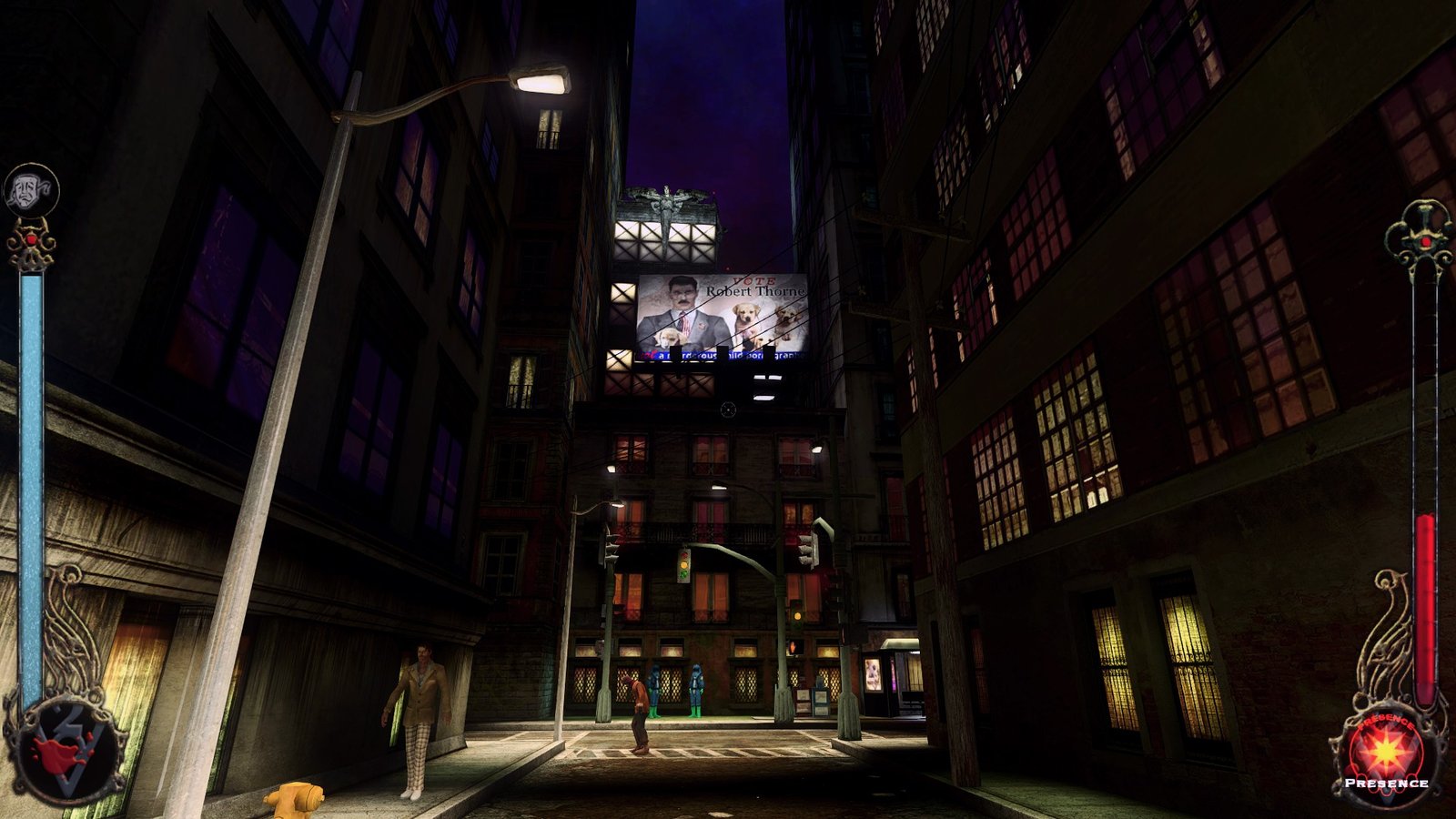 Comme je le mentionnais en introduction, ce qui vaut de nos jours ce suivi et ce statut de cult classic à VtMB, ce sont ses qualités tellement fortes qu’elles viennent faire oublier les nombreux problèmes du titre. Qualités qui tournent pour la plupart autour de la plus grosse réussite du titre, l’immersion dans le Monde des Ténèbres et sa version de L.A. au début des années 2000. Ça passe par une qualité d’écriture magistrale, collant parfaitement au matériel original. Brian Mitsoda a eu carte blanche, dans le ton et le langage utilisé, Bloodlines étant un titre pour public averti. Que ce soit les dialogues, les personnages et leurs quêtes, les notes trouvées ou autres emails, tout est très bien écrit avec une cohérence globale maintenue tout au long du titre.