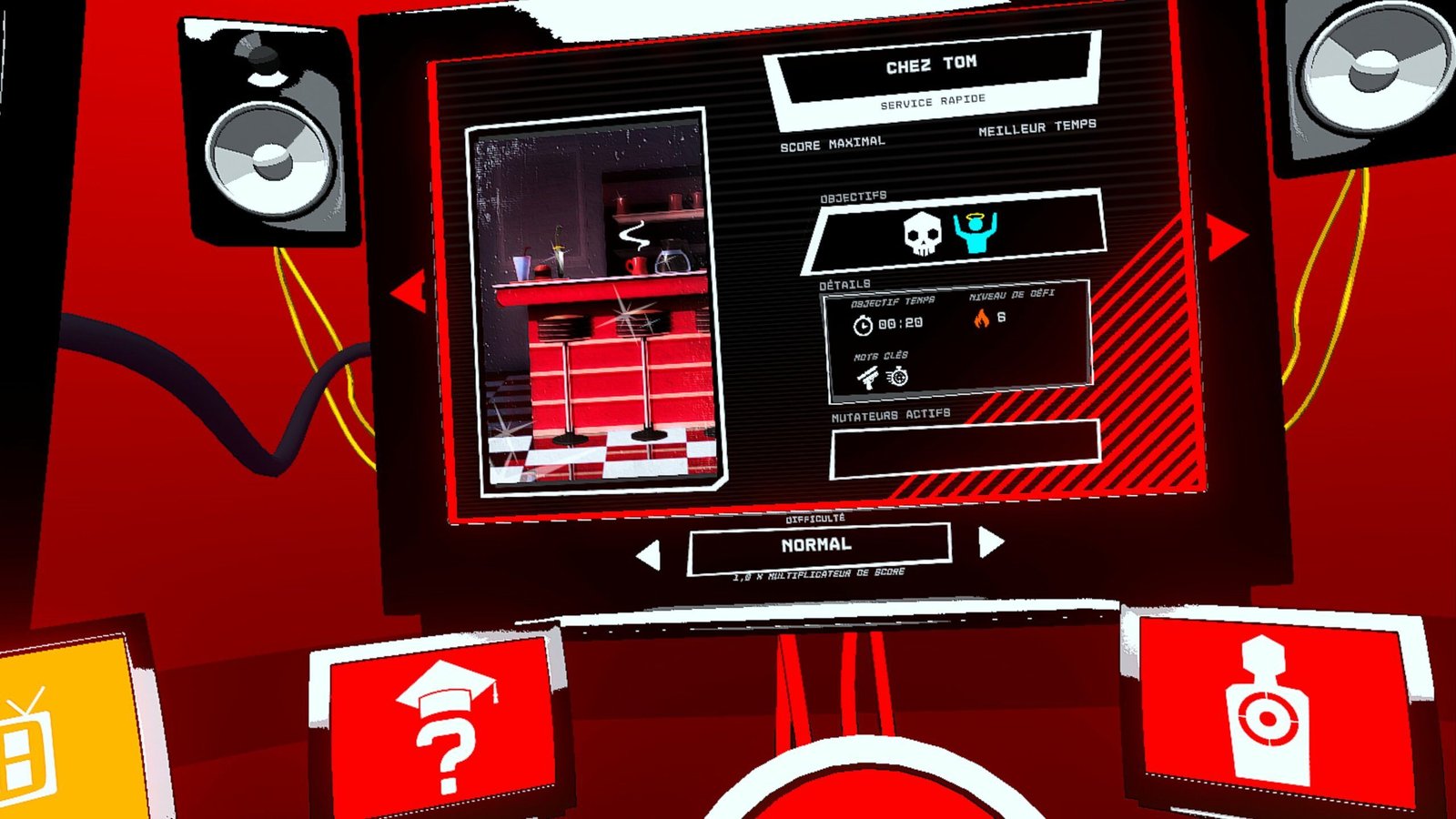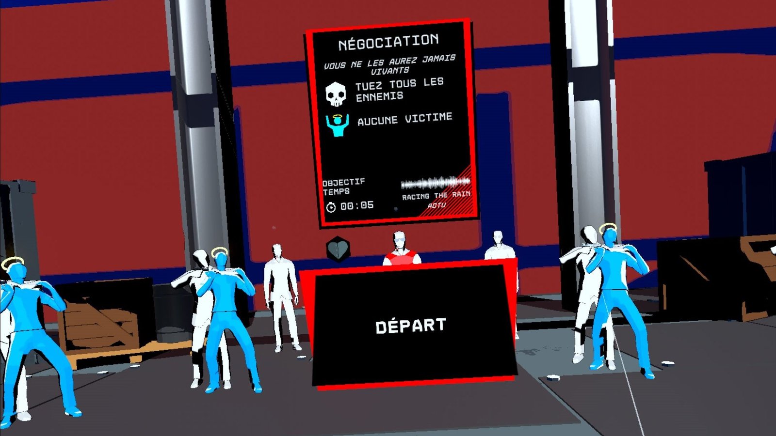 Notons que, comme dans Pistol Whip, ou même Beat Saber, le titre donne la possibilité, en plus des trois niveaux de difficulté, d’appliquer des modificateurs, appelés mutateurs, donnant soit un avantage avec, en contrepartie, un taux de points réduit, ou, à l’inverse, un désavantage pour glaner plus de points (ennemis plus rapides, assistance à la visée réduite, moins de santé…). Ceux-ci peuvent se cumuler et permettent de passer des niveaux ardus, mais il faut auparavant les débloquer en utilisant suffisamment le mutateur précédent. Et au cas où vous coinceriez vraiment sur une scène, le mutatteur « Iron Heart », qui rend invincible, est automatiquement offert après trois morts consécutives. Cela permet de découvrir sereinement le niveau pour parvenir à le franchir ensuite en situation normale, bien vu. Bien entendu, le multiplicateur de score est, dans ce cas, très fortement réduit.