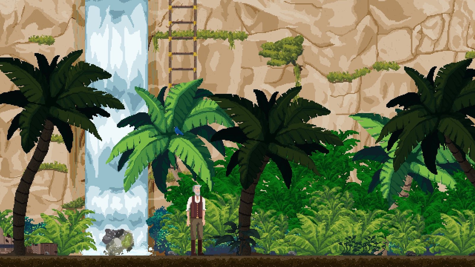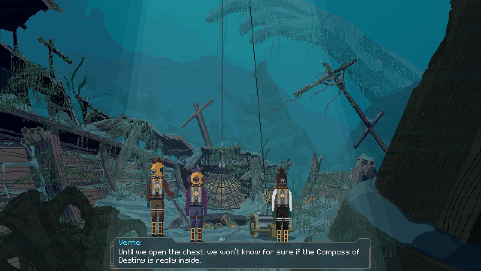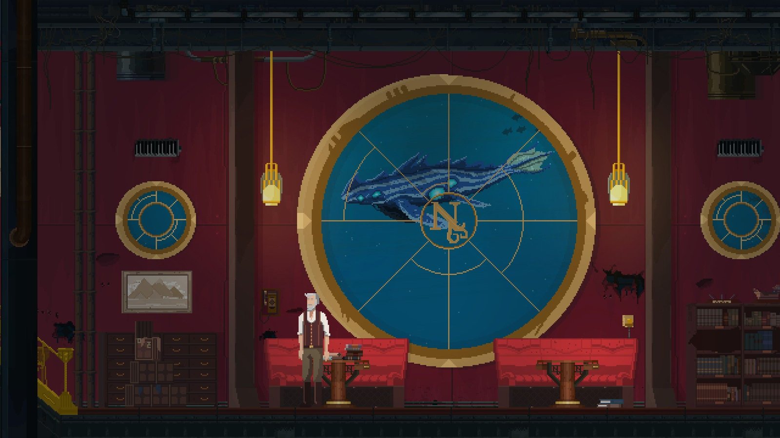 Nous suivrons donc Verne et l’équipage du Nautilus aux prises avec l’unité d’élite de la Nation, et à la recherche d’un dernier espoir pour rétablir la paix, le tout au cœur de la mythologie Atlante. En termes de gameplayOu « jouabilité » en français, fait référence à la façon dont le joueur interagit avec un jeu vidéo., Verne: The Shape of Fantasy se présente sous la forme d’un jeu d’aventure 2D vu du côté, comme dans un plateformerUn genre dont le gameplay principal repose sur aller d'un point A à un point B, entrecoupés de séquences de sauts ou équivalents. , la nécessité de skill en moins, où les déplacements et interactions sont prévus pour se faire principalement à la manette. Pour comparaison, on retrouve un style proche avec les jeux d’aventure Lacuna ou encore Tales of the Neon Sea . Deux jeux qui partagent d’ailleurs leurs aspects pixel art avec Verne, qui s’en sort ici plus qu’honorablement avec de superbes visuels, mais par moments assez inégaux. On pense par exemple à une majorité de l’intérieur du Nautilus au final bien moins impressionnant que certains paysages absolument magnifiques.