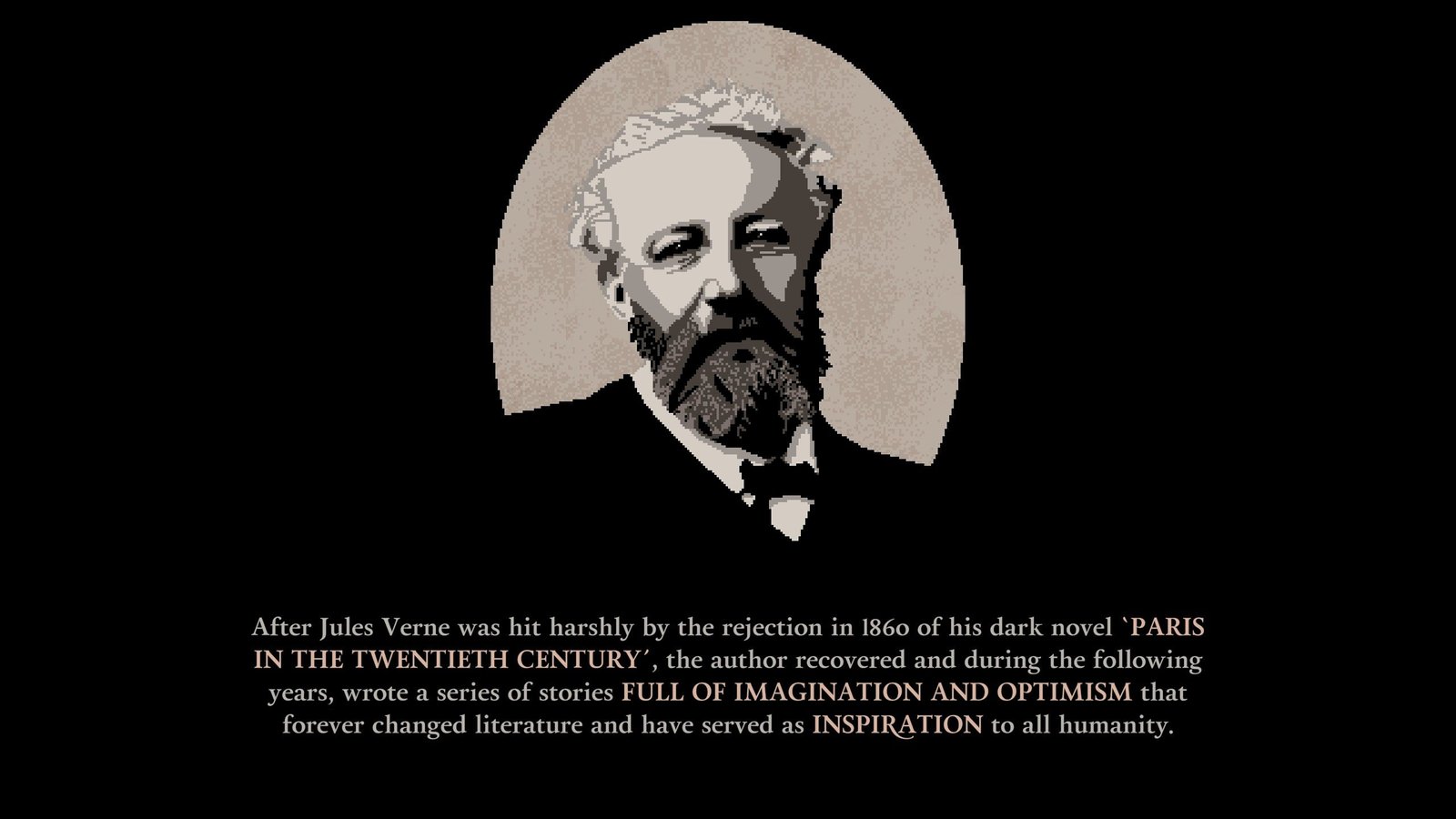 Verne: The Shape of Fantasy , comme le laisse présager son titre, est un jeu hommage à l’écrivain français Jules Verne. Cependant, il ne s’agit pas là de l’adaptation directe de l’un de ses romans, mais l’aventure vient plutôt placer l’écrivain lui-même au centre de l’histoire, en tant que protagoniste principal de l’aventure. Évidemment, on retrouvera beaucoup d’éléments de ses romans les plus cultes, comme le plus évident à première vue, « 20 000 lieues sous les mers », une bonne partie de l’aventure se passant à bord du célèbre Nautilus .
