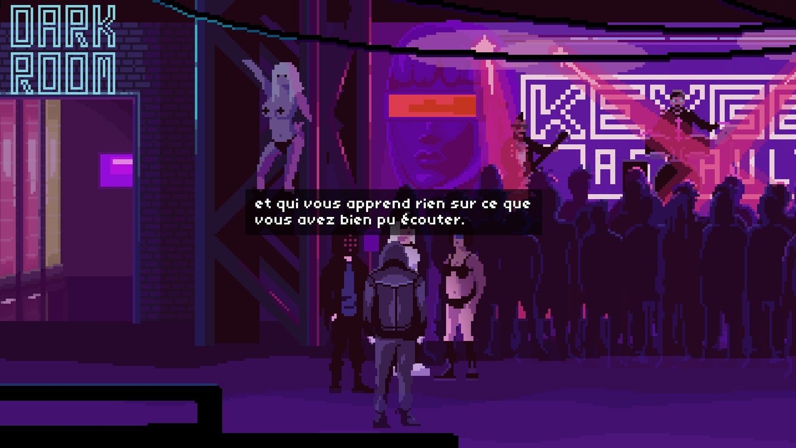 Les ennuis ne s’arrêtent pas là pour Nathan, puisqu’il se rend compte que sa bien-aimée a déserté le lit conjugal dans la nuit, sans explication. Ne reste donc plus qu’à sortir de l’appart, pour partir à sa recherche. L’occasion pour le joueur de découvrir une mégalopole plongée dans une obscurité éternelle et pervertie par un libéralisme agressif, alors que des drones publicitaires louvoient entre de gigantesques tours flirtant avec les nuages. On prend rapidement plaisir à arpenter les rues cradingues de cette cité, seulement éclairées par les néons mauves de gargotes à la nourriture insipide, et peuplées de camés accros aux trips numériques. La narration visuelle nous murmure, sans surprise, le mot « dystopie » dans le creux de l’oreille ; une dystopie qui vise à critiquer notre insatiable soif de nouvelles technologies, en soulignant ses effets pervers. Une intention louable, mais hélas mal exécutée.