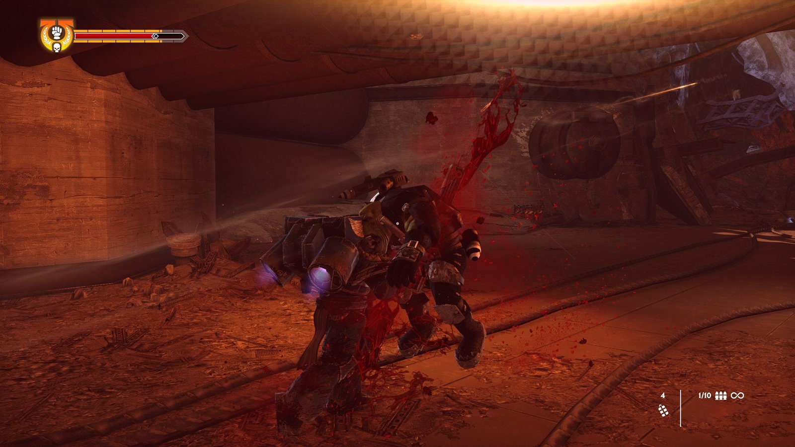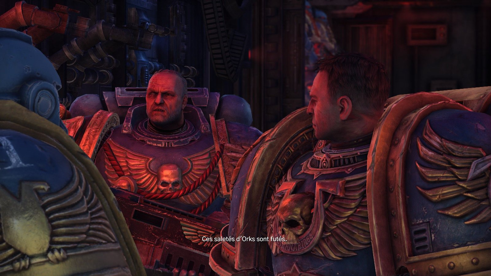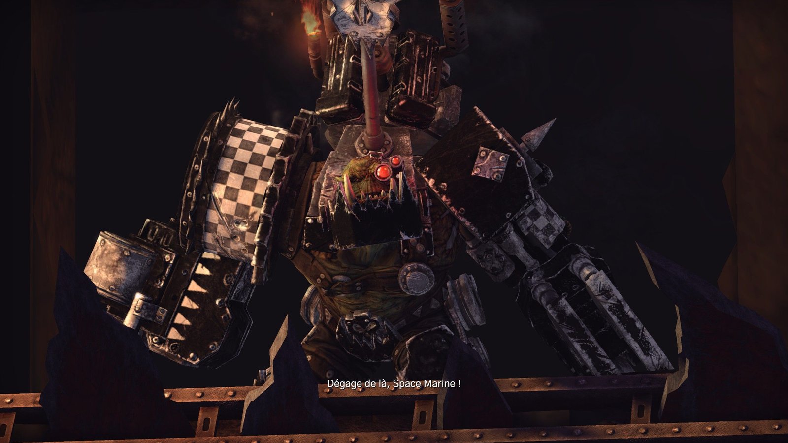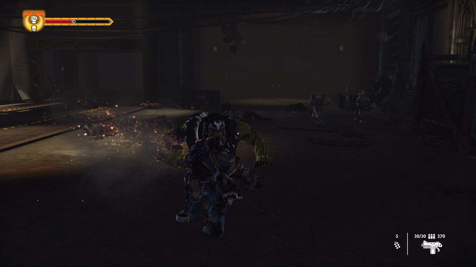 Concernant la durée de vie, on se contente du minimum syndical, le jeu se finissant en deux bons après-midi. Mais il a quand même le mérite de se terminer avant de devenir ennuyeux et la campagne solo se dote de suffisamment de variété pour ne pas lasser. Quelques boss et passages un peu différents parsèment le jeu (dont quelques passages avec le propulseur dorsal), par contre côté ambiance et décors, il faut aimer se balader dans des zones industrielles en ruines (de l’urbex avec des orcs quoi). Titus est accompagné de deux autres Ultramarines joués par l’IA et qui se révèlent plutôt efficaces pour se débarrasser du fretin pendant qu’on tabasse les plus gros. Leur présence et les barksRépliques ou onomatopées lancées par les NPC en dehors de phase de dialogue. incessants quand ils nous accompagnent rendent alors les passages sans eux plus oppressants. L’ambiance musicale n’est pas en reste avec une musique épique plutôt bien travaillée, aux cuivres omniprésents, de l’efficace martial. On a aussi un mode multijoueur franchement anecdotique, à base de défense de points et de hordes d’ennemis à désosser.