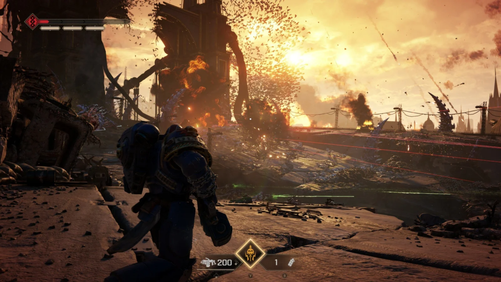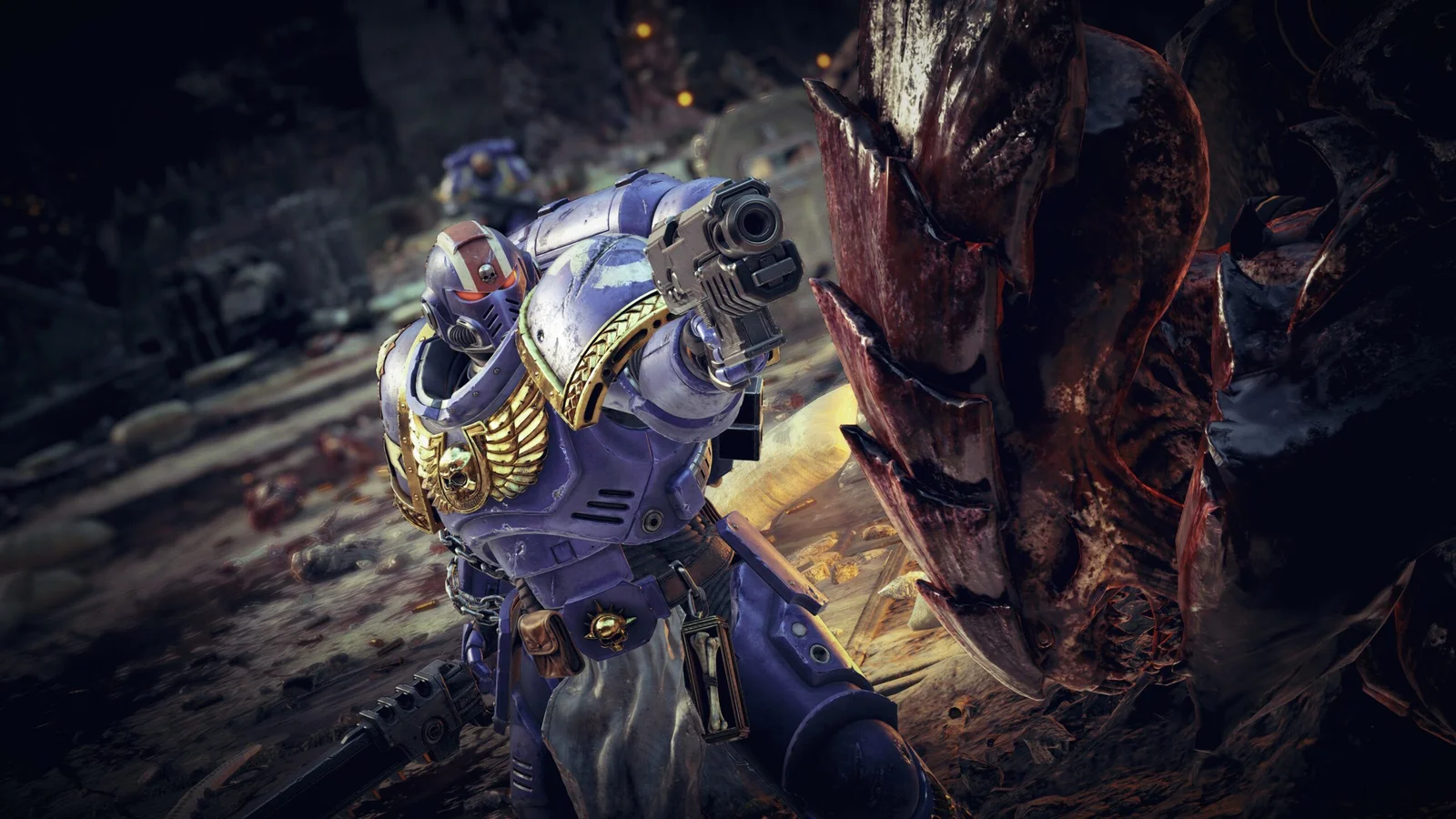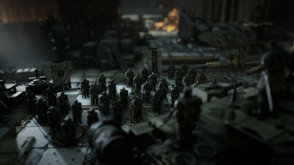 Bon, clairement, si vous êtes fan de la licence, vous allez peut-être vous ennuyer sur l’histoire. Déjà, parce que les Ultramarines, c’est toujours un peu ronflant comme chapitre (je pense que j’aurais même préféré un jeu sur la Deathwatch). Mais surtout, c’est vraiment « un lundi chez les G.I Joe de l’espace ». Seul un petit twist vers la deuxième moitié du jeu vous fera sortir de vos espadrilles (et encore). En revanche, si vous n’y connaissez rien, c’est probablement la meilleure porte d’entrée, notamment si l’univers vous intriguait déjà auparavant. Il faut être un peu curieux, mais rien que les concepts de Dieu-Machine exposés pendant l’histoire devraient vous faire lever un sourcil. On sent d’ailleurs que les personnes de chez Saber Interactive ont une grosse affinité avec le loreReprésente l'histoire et les traditions autour d’un univers de fiction, ne constituant pas l’intrigue principale d’une œuvre. et ont voulu le partager aux autres, comme des passionnés un peu fous, mais attendrissants.