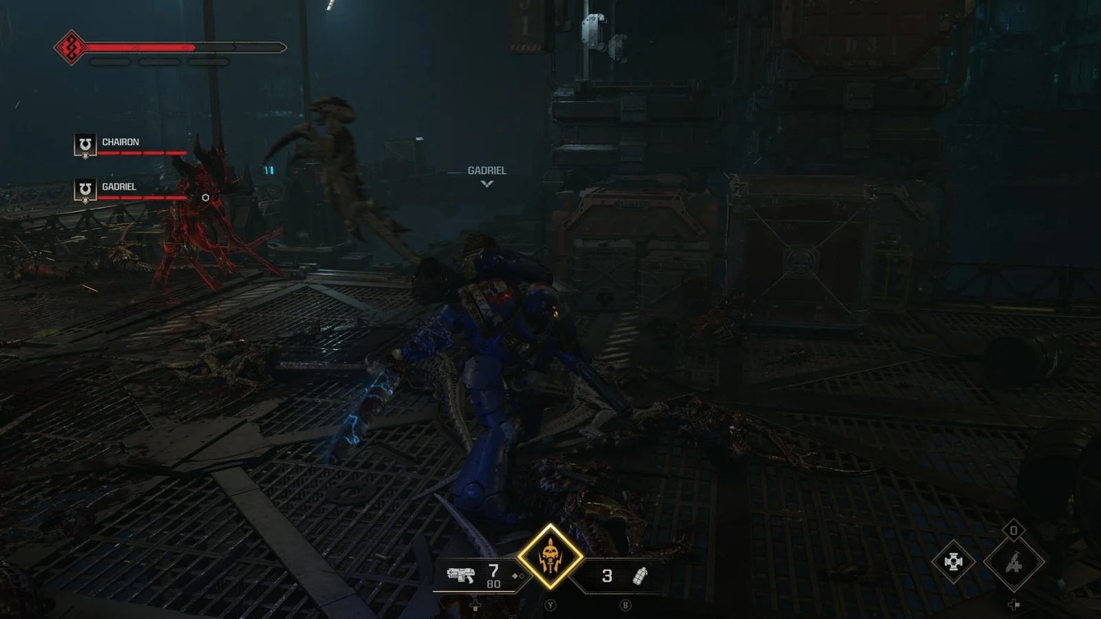 Est-ce que ça vaut vraiment le coup que je vous explique Warhammer 40K ? Outre la densité et la complexité de l’univers, je ne pense absolument pas avoir les qualifications nécessaires pour faire une présentation d’un univers qui existe et évolue depuis 1987. Personnellement, j’ai eu la chance de commencer la campagne avec, à côté de moi, un ami, barbu et mage noir de niveau 28 (encore merci à lui), il m’a donc expliqué deux ou trois trucs. Globalement, je peux au moins résumer les évènements de cette aventure : Titus, le héros du premier jeu, était en exil depuis un siècle dans la Deathwatch suite à un soupçon d’hérésie. Il se retrouve parachuté au milieu d’un conflit contre les Tyranides et sauve la planète envahie. Le voilà ainsi récompensé d’une promotion de Primaris (des Space Marines ++) saupoudrée d’un discours bien paternaliste de « Hé désolé pour l’exil, tu comprends, on ne pouvait pas être laxiste ». Nous voilà donc enrôlés pour participer à ce conflit, avec pour seul but de tuer tous ceux qui ne nous ressemblent pas. Hé oui, c’est un peu un truc de droite, Warhammer.