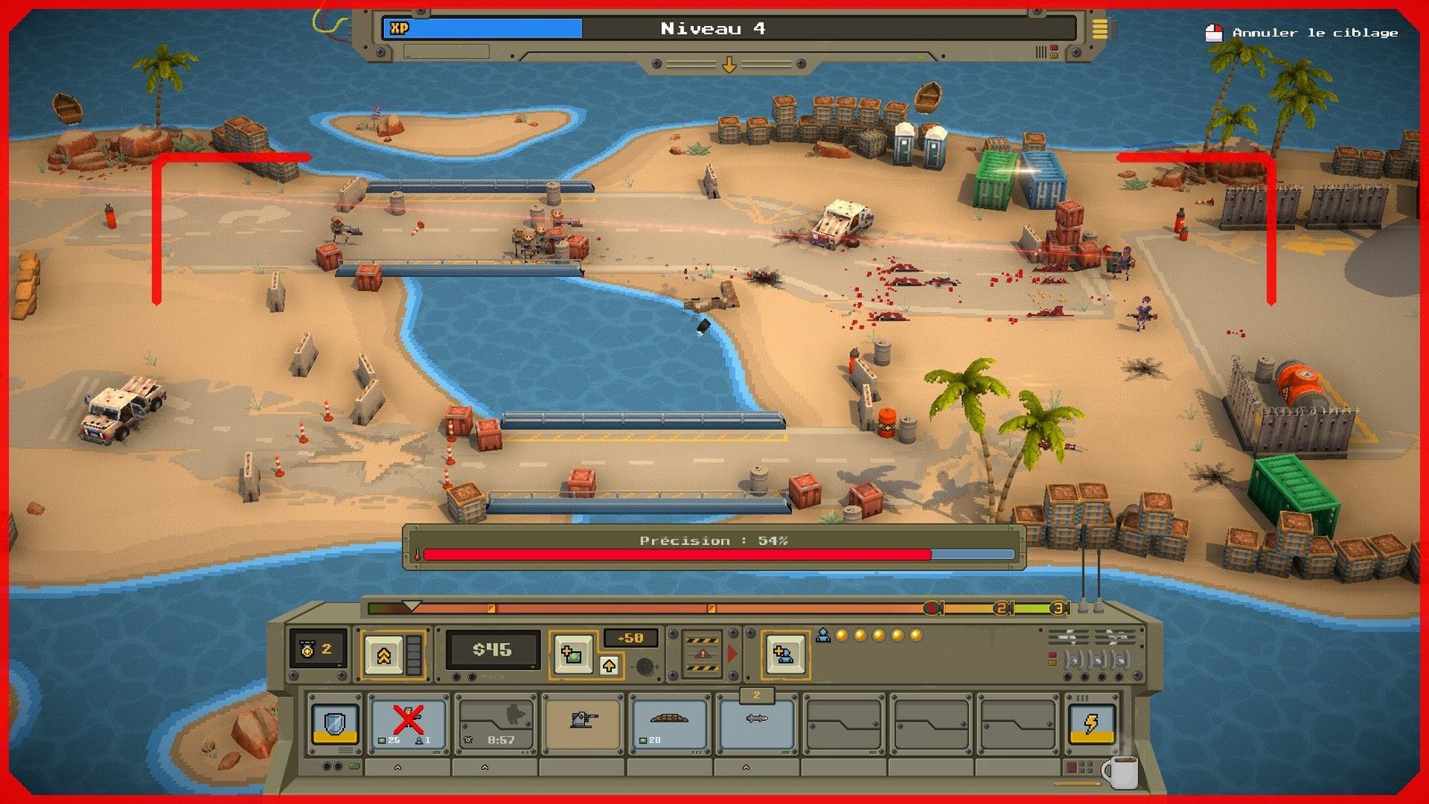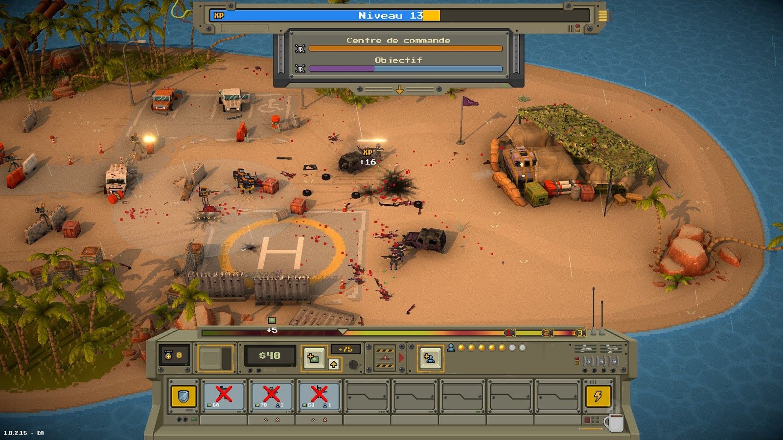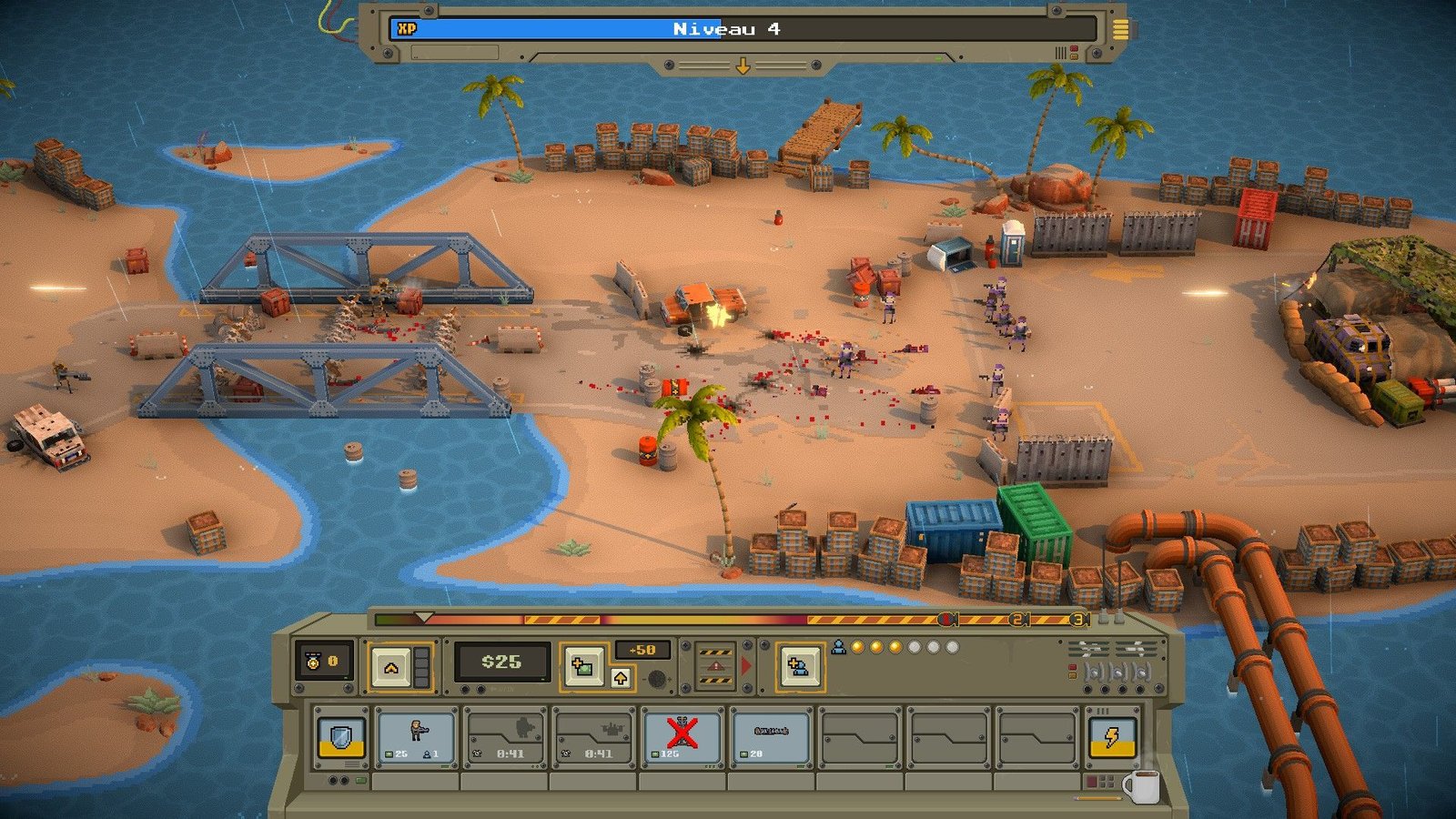 Les soldats, véhicules et objets (canons, zones de couvertures et autres interactions directes du joueur comme des missiles ou des drones explosifs) seront à choisir dans votre inventaire avant le lancement d’une mission. Votre inventaire se gonflant d’unités différentes au fil de vos réussites, il faudra les utiliser avec parcimonie à chaque mission, dans le but d’en posséder un large panel (et les plus utiles stratégiquement) pour le grand combat final contre la base de l’île que vous envahissez. Les premières parties vous montreront rapidement que c’est dans cette stratégie-là que Warpips trouve tout son intérêt. Spoiler : vos premières parties se termineront mal. Il va falloir apprendre dans la douleur.