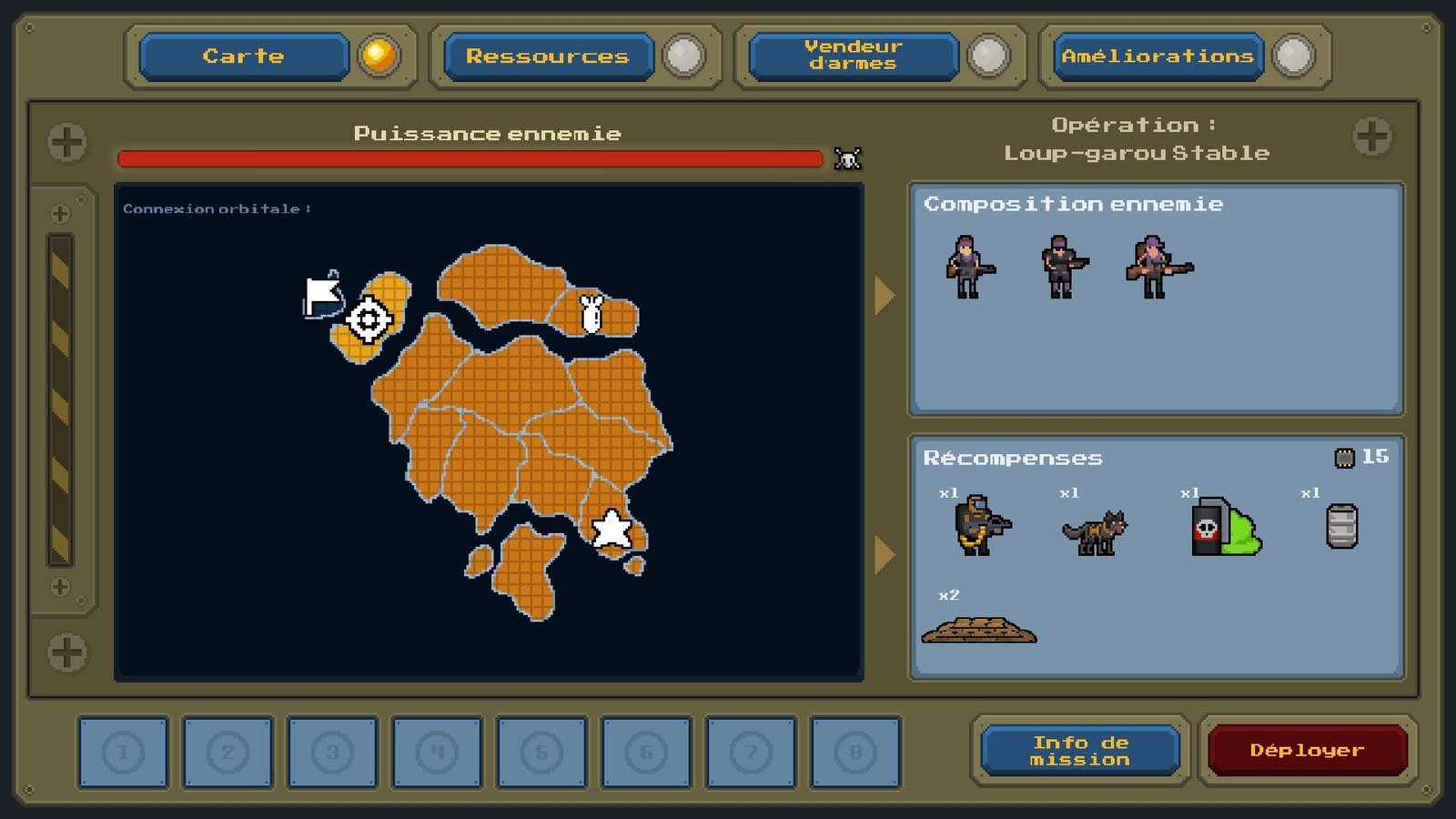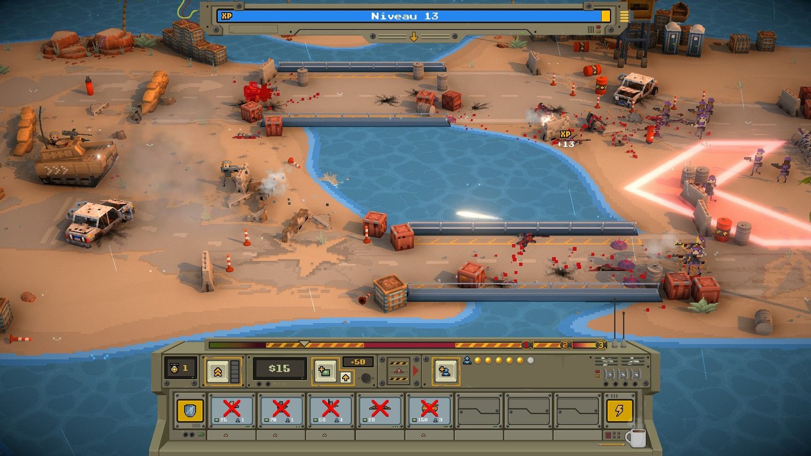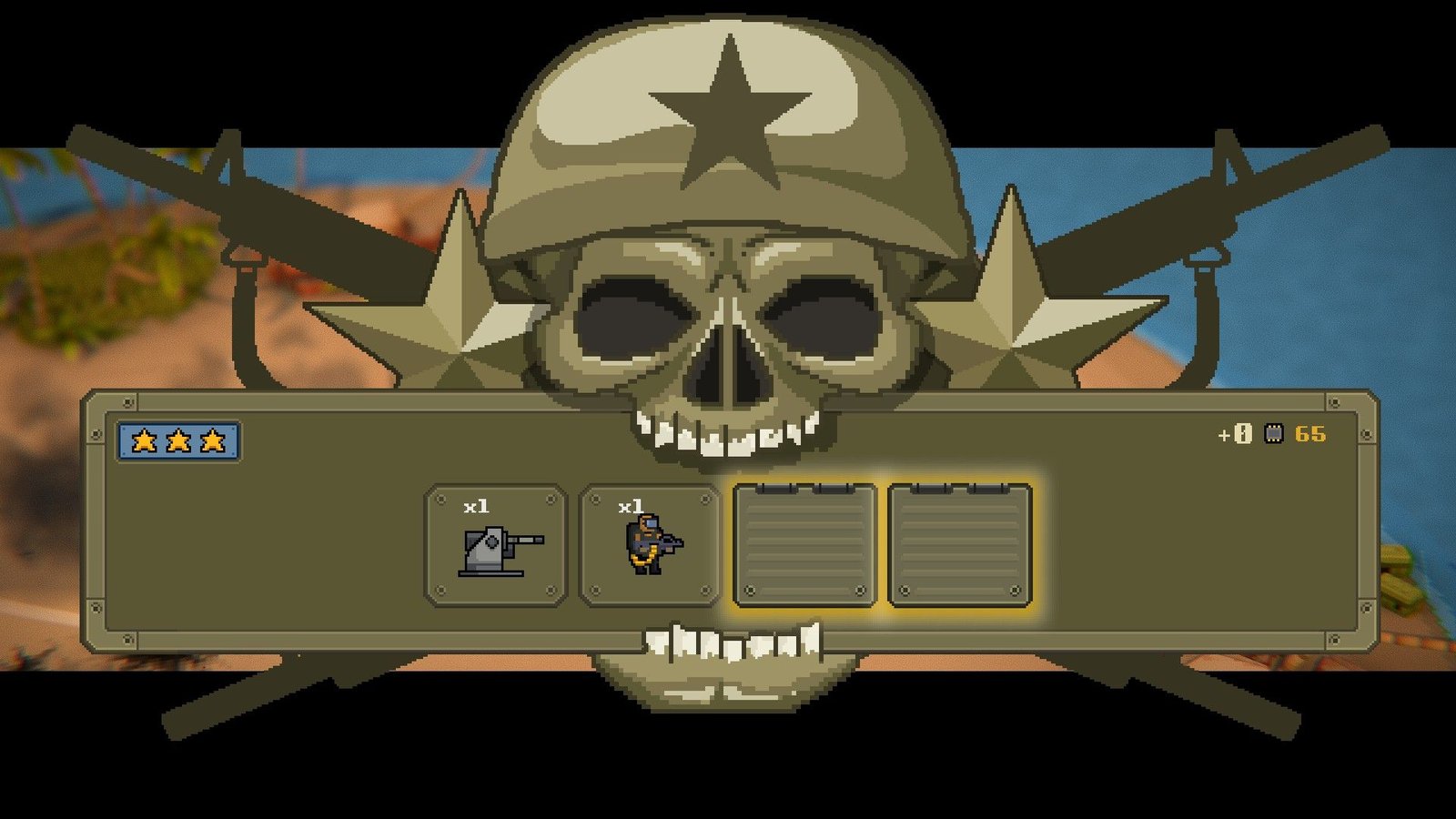 Les soldats, véhicules et objets (canons, zones de couvertures et autres interactions directes du joueur comme des missiles ou des drones explosifs) seront à choisir dans votre inventaire avant le lancement d’une mission. Votre inventaire se gonflant d’unités différentes au fil de vos réussites, il faudra les utiliser avec parcimonie à chaque mission, dans le but d’en posséder un large panel (et les plus utiles stratégiquement) pour le grand combat final contre la base de l’île que vous envahissez. Les premières parties vous montreront rapidement que c’est dans cette stratégie-là que Warpips trouve tout son intérêt. Spoiler : vos premières parties se termineront mal. Il va falloir apprendre dans la douleur.