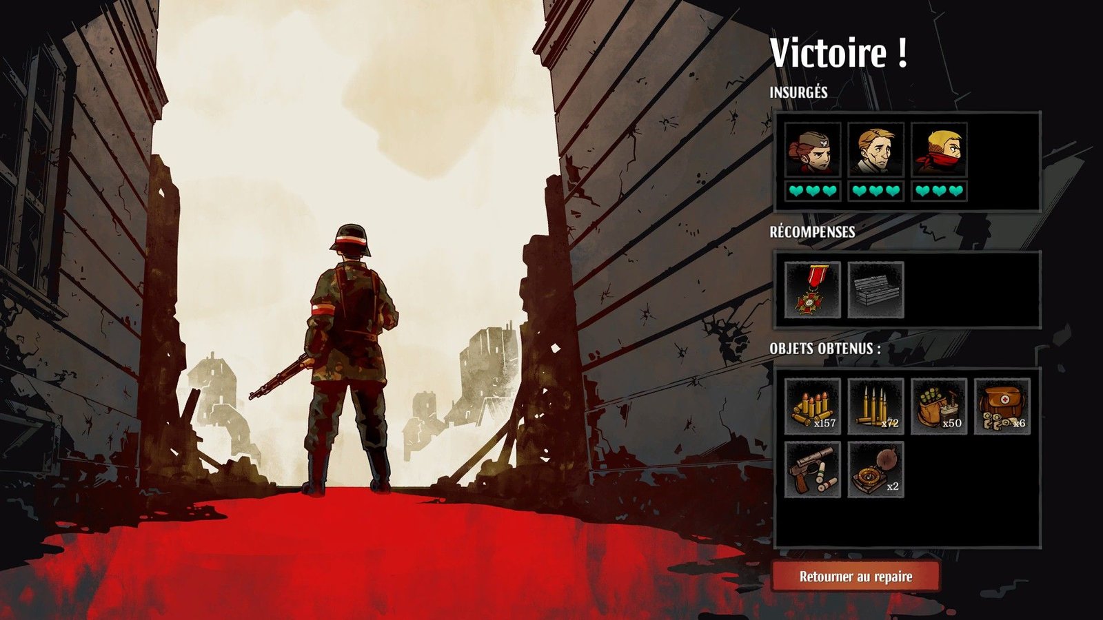 Warsaw est le second jeu ( à la ma connaissance) tentant de nous narrer l’histoire de Varsovie et de son Ghetto après My Memories of Us sorti il y a presque un an. Ici on nous montre la résistance dans ce ghetto, où vous devrez envoyer des escouades tuer des nazis, délivrer un quartier en tuant des nazis mais aussi récupérer des provisions en tuant des nazis. Pour cela, vous vous déplacerez dans l’un des six quartiers de Varsovie, où vous dirigerez votre escouade jusqu’à trouver des points d’intérêt (des nazis, des événements à choix ou des provisions). Très inspiré par Darkest Dungeon, on y retrouvera aussi bien le coup de crayon que la pression des combats (un cran inférieur ) avec ses multiples malus. À la fin de chaque mission, on voit la progression de la libération de Varsovie en fonction de la réussite ( ou non ) de notre objectifs et des buts non atteints.
