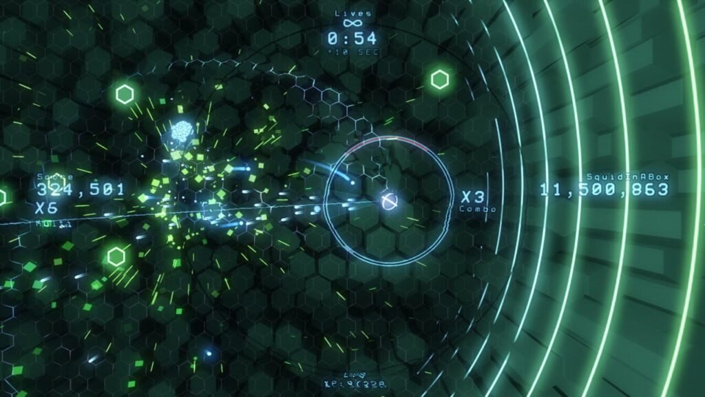 Le très classique mode Survival est aussi de la partie : 3 vies, temps illimité et pour le reste, le principe de jeu est le même que pour Crunch Time mais ça n’en est pas moins fun. Le mode Rush est un mode au temps très limité et aux vies infinies. Le but est de tenir le plus longtemps possible, tout en ayant la possibilité de récolter quelques secondes en tuant certains ennemis. En mode Challenge, vous serez confronté à une vingtaine de petites épreuves en temps restreint, le plus dur étant de remporter les 5 étoiles dans chaque niveau. Et enfin, vous serez démuni de tir en mode Bombing Run où le principe est de récupérer des bombes puis de les faire exploser moins de dix secondes après en atteignant une cible verte, tout en slalomant entre les ennemis. La bombe des autres modes est remplacée par un bouclier très utile qui se déclenche lorsqu’un ennemi vous touche, mais qui peut également être balancé manuellement.
