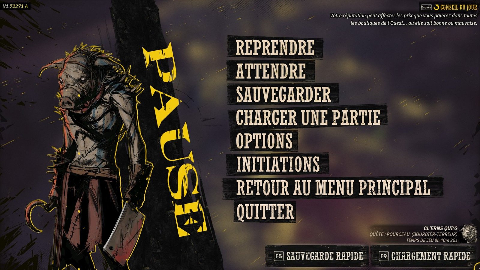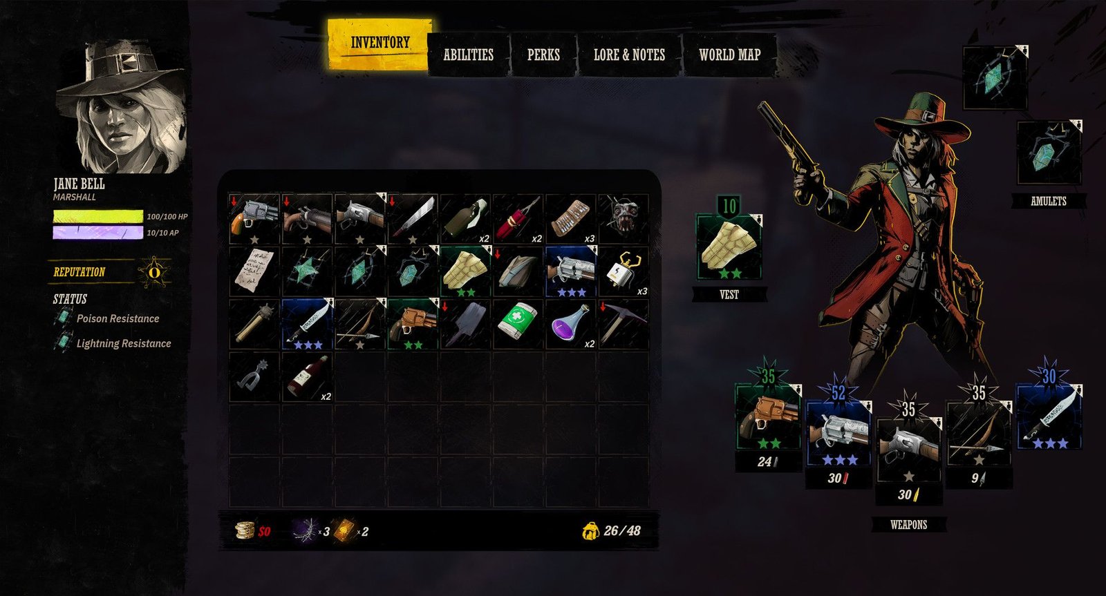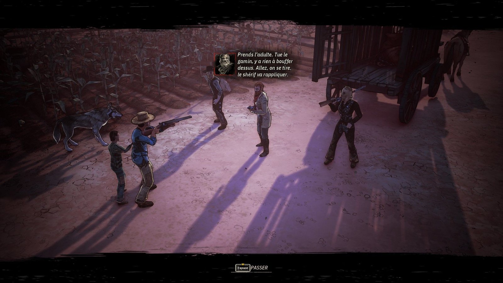 Dans son emballage, le jeu ressemble beaucoup à un cRPG« Jeu de rôle sur ordinateur», un terme se rapportant aux jeux de rôle occidentaux pour les séparer des JDR sur table, et en opposition aux RPG japonais. à l’ancienne. Pas de « vrai » monde ouvert ici, mais plutôt des zones plus ou moins grandes, dispersées sur la carte du monde, pardon de l’Ouest, sur laquelle on se déplace d’un point à un autre avec des chances de rencontres aléatoires, tel un Fallout avant lui. On regrettera d’ailleurs que les déplacements soient un peu lents, et on a un peu l’impression de perdre du temps en regardant son pion se déplacer doucement vers une destination. On retrouvera donc des points d’intérêt, et des marqueurs indiquant où se trouve le prochain objectif de la quête principale ou des quêtes secondaires et activités annexes (comme, Far West oblige, remplir une activité de chasseur de primes après avoir récupéré les fameux posters « Mort ou vif » placardés sur le tableau de bord du shérif local). On note également la présence d’un système de réputation, qui augmentera avec la résolution de quêtes et de bonnes actions, et à l’inverse, diminuera si on vous voit commettre un crime. La réputation est d’ailleurs gérée globalement, non pas par ville, mais dans tout l’Ouest. Le système reste cependant parfois un peu opaque, et il est par moment un peu compliqué de comprendre pourquoi on perd des points. Il m’est également arrivé d’avoir une double pénalité de points pour la même action (mais il s’agit plus probablement d’un bug ?).