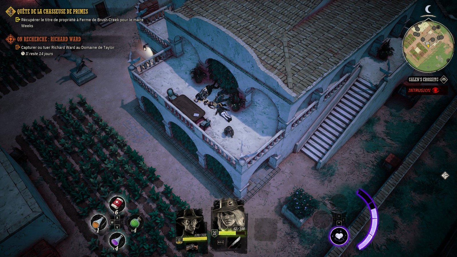 À la différence des anciens projets des fondateurs de WolfEye Studios, tels Dishonored ou Prey , au budget bien plus élevé, le choix a ici été fait d’une 3D isométrique stylisée, avec un gameplayOu « jouabilité » en français, fait référence à la façon dont le joueur interagit avec un jeu vidéo. d’action plus proche du twin stick shooter. Au niveau de l’action d’ailleurs, les combats ont pas mal de pêche et on prend vite plaisir à faire parler son revolver, même si on a vite fait de s’emmêler les pinceaux dans le cœur de l’action au vu du nombre d’ennemis parfois important et des possibilités d’actions. C’est d’autant plus vrai si le combat n’était pas prévu, comme lorsqu’on est repéré en pleine infiltration par exemple… Heureusement le changement d’arme, plus exactement l’ouverture de la roue de sélection d’arme, ralentie le temps, suffisamment pour offrir un léger répit dans une action qui peut donc s’avérer fort confuse. Autre atout dans notre manche pour se sortir des pire situations, on peut également effectuer des plongeons de côté ou vers l’arrière, tel Max Payne , ou utiliser une tripotée de capacités spéciales, plus exactement jusqu’à 4 spécifiques par personnage, et 4 compétences spécifiques par arme (par exemple effectuer un tir silencieux à la carabine, ou encore utiliser des dégâts électriques avec le revolver). Attention cependant, chaque action spéciale viendra piocher dans votre jauge d’action, et il faudra ensuite attendre qu’elle se remplisse ou utiliser des potions à cet effet. Il est donc assez plaisant de faire parler la poudre, surtout si on est bien préparé au combat. À noter aussi que l’on peut faire usage de l’environnement en prenant avantage de barils explosifs, de pétrole inflammable, voire même de conteneurs chimiques.