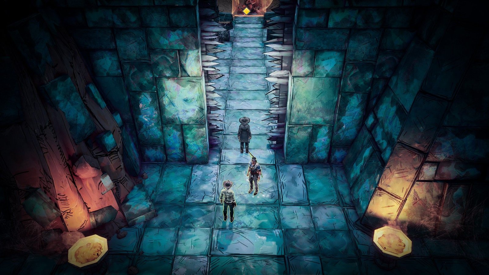 Tout commence par une personne encapuchonnée, assise sur une chaise au milieu d’une pièce. Devant, sur le sol, un étrange symbole. Accrochés sur des piliers, 5 portraits de personnages dont l’on ne distingue que la silhouette. Une scène que l’on reverra plusieurs fois au cours de notre partie. Car si l’on commence avec la tragique histoire d’une ancienne chasseuse de primes à la retraite, dont le fils est assassiné sous ses yeux et le mari enlevé, on s’apercevra bien vite que l’on contrôlera au final 5 personnages différents, à travers lesquels on découvrira l’univers sombre et fantastique de Weird West. On y trouvera un monde difficile où le danger peut venir non seulement des bandes de hors la loi peuplant l’Ouest, des politiciens véreux, mais également des créatures surnaturelles. Citons notamment les Pourceaux, sortes d’homme-porcs extrêmement agressifs, ou encore les Sirènes, créatures cauchemardesques friandes de chaire humaine. Et c’est d’ailleurs bien là le gros point fort du titre, son univers et son ambiance.