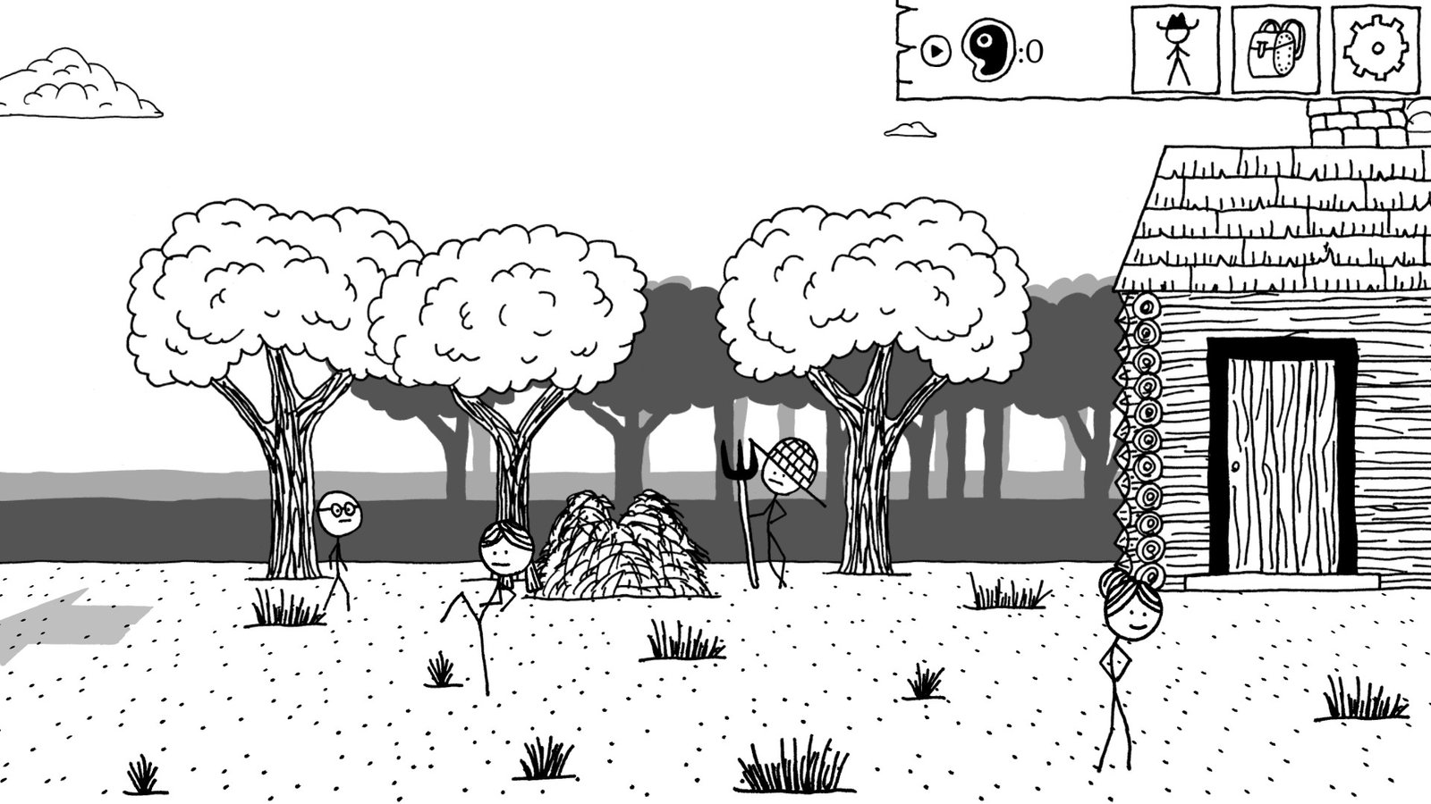 Rapidement, on découvre quelques actions impossibles à effectuer sans le bon outil. Une pelle pour creuser, une corde pour descendre dans un puits, une pioche pour obtenir quelques minerais rares… Oh, par contre j’oubliais de vous dire : tout le jeu est en noir et blanc (sauf parfois les polices d’écriture et quelques menus) et surtout, tous les personnages sont dessinés à l’aide de traits, façon « splastick » comment disent nos ami.e.s anglophones.