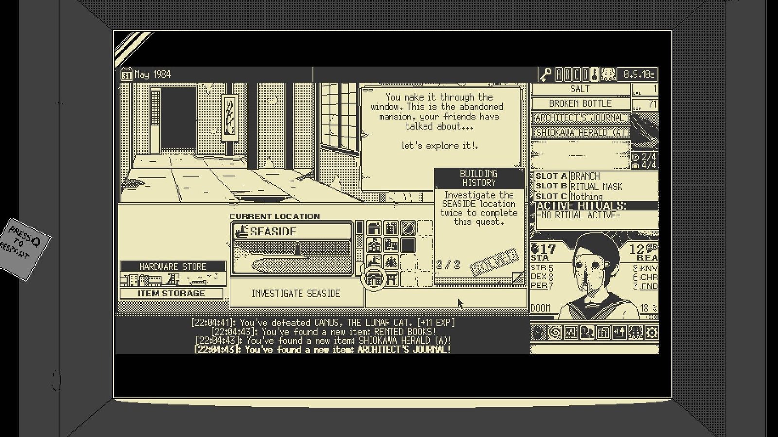 Se déroulant au Japon du milieu des années 80 avec une grosse emphase lovecraftienne, World of Horror est à la fois un rogue-like, un jeu de rôle et un jeu narratif. Du premier il prend la partie unique avec permadeath , où la mort signifie recommencer le jeu de zéro sans rien garder de notre partie, en dehors de l’expérience que le joueur lui-même aura acquis face aux différents événements qu’il aura rencontrés. Du jeu de rôle il récupère la fiche de personnage avec les caractéristiques classiques ( force, endurance, chance, etc. ), le level-up et la gestion d’équipement étant donné que notre personnage peut porter une arme, deux objets ainsi que des sorts magiques. Enfin, le jeu est très typé narration.