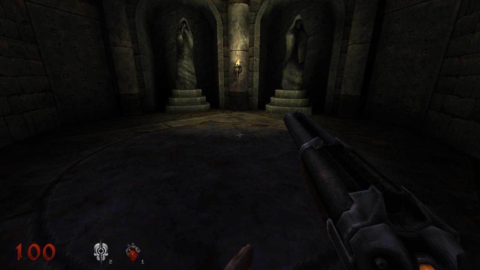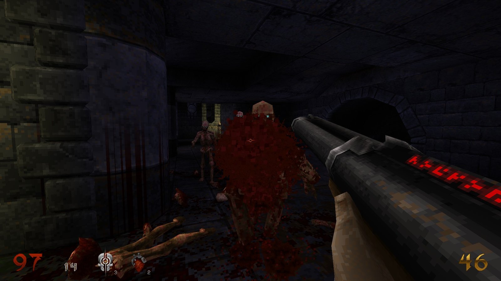 La filiation avec les titres fast FPS des années 90 est évidente en regardant les captures présentes de-ci de-là. En effet, WRATH est développé sur le moteur de Quake premier du nom (fortement moddé, évidemment) par une petite équipe de fanatiques opérant sur la scène du modding de ce même moteur depuis des années. Il est donc évident qu’en utilisant le moteur de Quake, on se retrouve avec un jeu qui ressemble à Quake. Oui. Voilà. Il en reprend en partie le principe d’ailleurs : on est au départ dans un hub qui, après une petite exploration, permet d’aller et venir dans des niveaux plus grands dans lesquels on doit trouver un zilgueulbeuz magique et évidemment réduire la population locale un brin agressive à l’état de pulpe sanguinolente. Le jeu met à notre disposition un arsenal des plus classique, et malgré l’aspect gothico-médiéval des niveaux, il s’agira plutôt de pétoires diverses et variées plutôt que les arbalètes, haches ou autres qu’on s’attendrait à y trouver. Mais bon après tout, pourquoi s’embêter à aller au corps-à-corps combattre des démons quand un fusil à double canon plein de plomb fait aussi bien le travail sans avoir à trop s’approcher ?