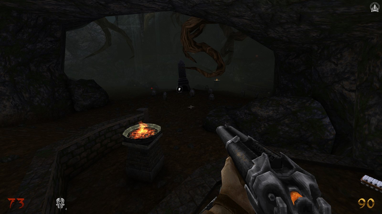 Chaque niveau nous emmènera dans un univers un peu thématisé, un niveau relativement grand et labyrinthique, à la recherche d’armes, d’artefacts et du bidule magique à retrouver, donc. Les niveaux sont plutôt bien fichus, avec pas mal de situations différentes mais qui camouflent assez mal le côté « couloir menant à une arène » même si une composante exploration est présente. Le gros souci du jeu repose sur un rythme assez bancal. Les ennemis sont certes nombreux et vindicatifs mais ils auront tendance à arriver par paquets, leur apparition étant déclenchée par un certain nombre de scripts invisibles comme en récupérant une fiole de soin isolée, en appuyant sur un bouton ou en passant un seuil. A l’ancienne donc. Le souci c’est que ça fait très vieillot, et même si c’est le but recherché, on sent que les auteurs n’ont pas voulu aller trop loin de l’hommage. Alors, quand même, au-delà de la recherche absolue des sensations de l’ancien monde des fast FPS il y a des originalités. Le système de quick save, par exemple, les concepteurs ont dû se dire que les joueurs de maintenant sont trop habitués à faire des sauvegardes n’importe quand n’importe comment et ont donc décidé de raboter un peu ça, en proposant un système de sauvegardes limitées en nombres ! Il faut trouver des petits crânes rigolos pour avoir le droit de les utiliser n’importe où et sauvegarder. Ça peut sembler être une bonne idée, mais malheureusement on ne fait là qu’allonger la durée de vie du jeu de manière artificielle. Faut laisser les gens utiliser les sauvegardes quand ils veulent enfin ! Tout le monde déteste les checkpoints ! D’autant plus dans un FPS particuliètrement difficile où les ennemis sont des sacs de points de vie et où ceux du joueur baissent extrêmement vite !