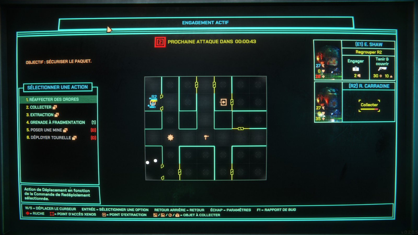 Vous êtes un commandant d’escouade qui doit diriger un groupe de soldat•e qui auront pour mission de s’infiltrer dans un bâtiment, réaliser un objectif, puis s’exfiltrer. Mais vous n’êtes pas le type de commandant qui va sur le terrain, couteau entre les dents en première ligne. Non, vous êtes plutôt du genre à rester derrière votre écran, chocolat chaud à la main, à donner des ordres. Pour ce faire, vous n’avez qu’une vue limitée, avec le détail du bâtiment en mode « plan d’architecture (mais si vous savez, le blueprint de Blue Prince) », qui se dévoile au fil que les petits points blancs, votre escouade, découvre les lieux. Si au départ, on ne démarre qu’avec deux soldats, on pourra en recruter deux supplémentaires au fil de la progression. Celle-ci sera une alternance de mission / upgrade, sur laquelle il faudra choisir sa route (je vous laisse regarder l’un des screens qui accompagne cette preview pour visualiser la chose). Actuellement, seuls quatre types d’objectifs sont proposés : détruire une ruche, collecter un certain nombre de données, récupérer une mallette de donnée (qui apportera un malus de déplacement et de visée, ainsi que le remplacement votre aptitude de corps à corps, on y arrive, pas d’inquiétude) et enfin escorté un VIP au point de sortie. Cette dernière a la particularité de vous priver d’un soldat (lorsque vous en avez 4) car vous ne pouvez pas avoir plus de quatre personnes en même temps à diriger.
