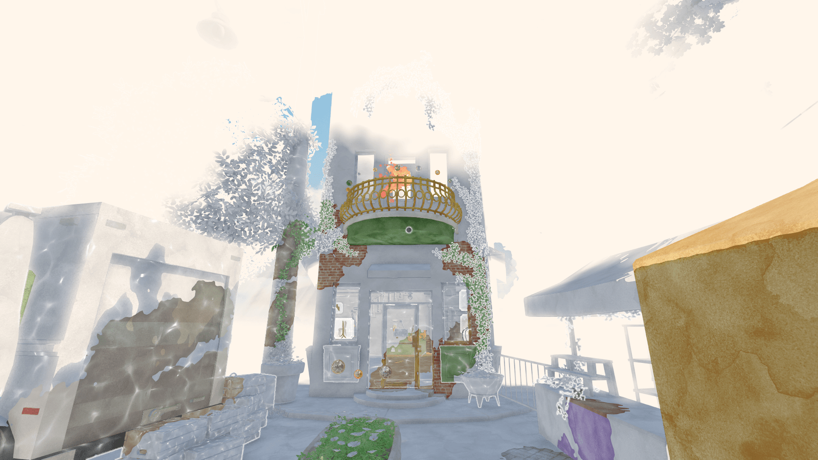 Signalons également le système de peinture très bien pensé à base de collages que l’on récolte en coloriant chaque objet de l’environnement, et les pigments disséminés dans les zones qu’il faudra découvrir 3 par 3 pour augmenter les couleurs disponibles sur notre palette. Quand je disais que le public montréalais était généreux, c’est qu’il en a bouffé du camaïeu de fleurs vertes avant que je ne débloque une autre teinte… C’est ergonomique, plutôt marrant et permissif : envie de réaliser une croute uniquement composée de barrières de chantier titrée « Paris 2024 » ? C’est possible et si j’ai mis autant de temps pour sortir cette critique, c’est en partie à cause des immenses possibilités qui m’étaient offertes pour les captures d’écran de ce test.