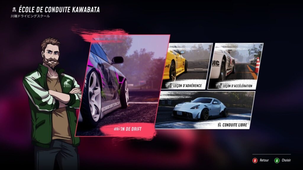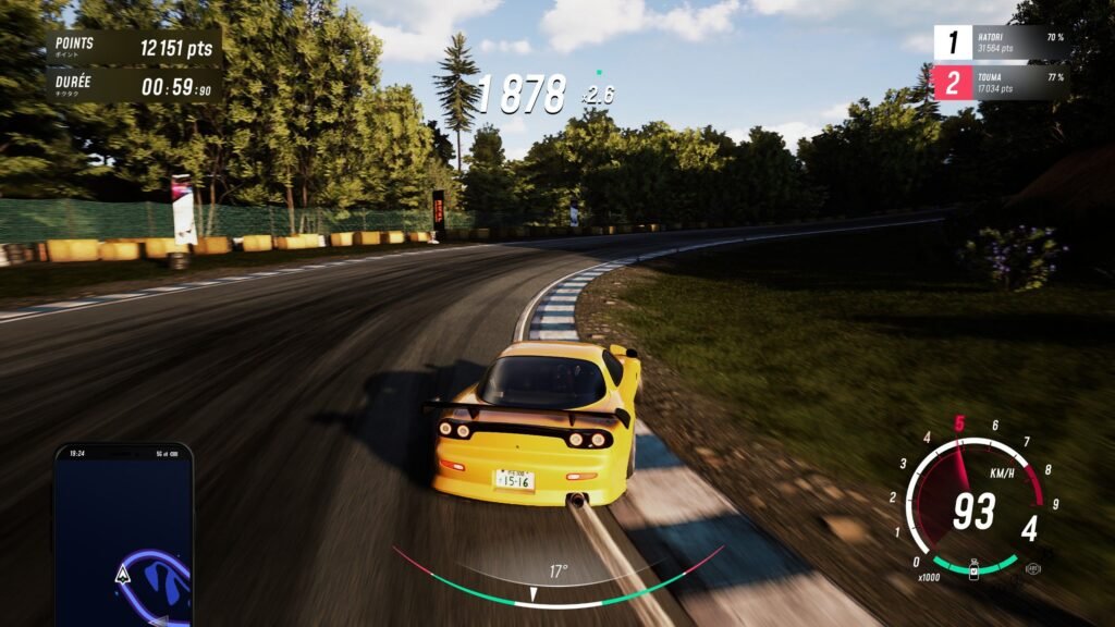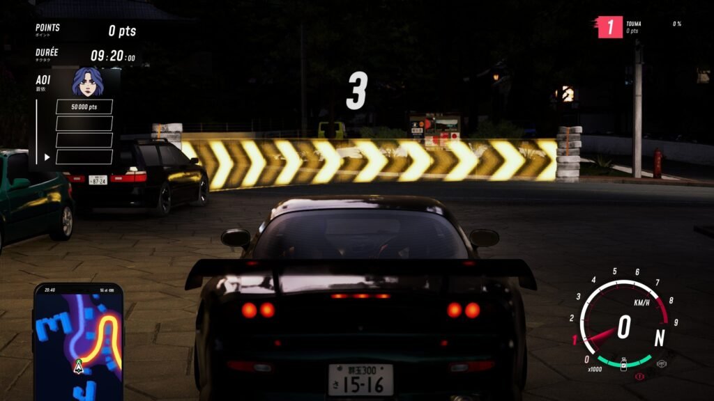Bon c’était quand même beaucoup de ligne pour dire que chaque « cinématique » me permettait d’alimenter une batterie sur éolienne tellement je soufflais devant mon écran. Laissons place un peu au gameplayOu « jouabilité » en français, fait référence à la façon dont le joueur interagit avec un jeu vidéo. ! Comme dit plus haut, les développeurs ont passé beaucoup de temps à prendre les retours des joueurs sur la démo pour peaufiner au max la conduite. Au début, bon, ce n’est pas trop ça, les voitures n’ont vraiment rien dans le cul. Le drift est un peu compliqué, surtout quand, après t’avoir filé deux minutes au début une Silvia taillé pour être mise en travers, on te refile un vieux tacot fatigué qui peine à se jeter dans un virage en fond de 3ᵉ. De plus, les différents trajets de drifts sont pensés pour des voitures plus véloces, donc on passe beaucoup de temps au début à zigzaguer en ligne droite pour pas perdre son multiplicateur, ce qui, il faut le dire, est un peu ridicule.