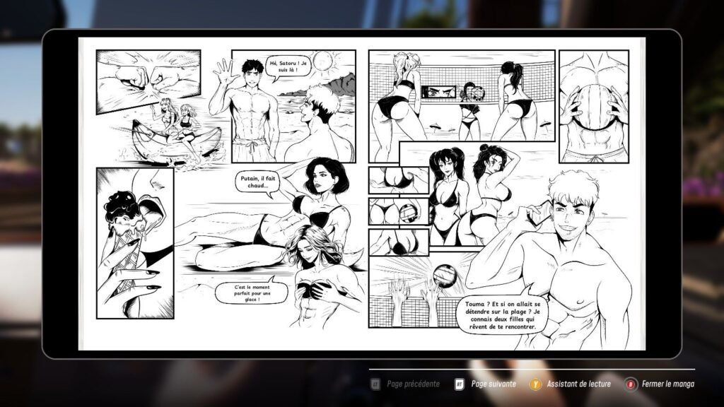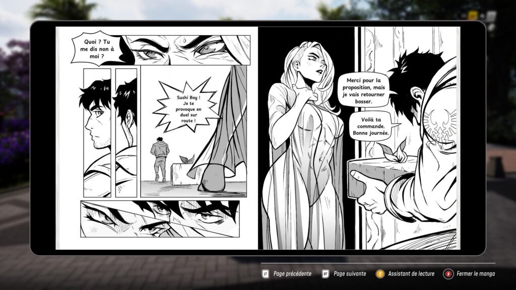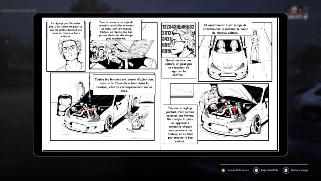 Mais reprenons depuis le début, voulez-vous, parce que visiblement JDM à une histoire, qu’il raconte au travers de ce fameux manga à lire dans une liseuse virtuelle. Alors, je ne sais pas si c’est la mode des webtoons qui fait ça, ou bien si c’est simplement que les devs sont tous des darrons, mais je trouve l’idée bof. J’entends bien l’hommage à Initial D , mais ça me semble un peu feignant. Surtout qu’on a souvent le droit à une double-page et rien de plus, et que les rares fois où ils font plus de page, c’est confus dans le déroulé. Le crayonné est un peu passe-partout, il manque d’une vraie identité (on dirait les dessins que vous avez sur les cahiers « Apprends à dessiner des Mangas « ) et il n’y a même pas une quelconque mise en scène sur les cases, à part deux ou trois bruitages.